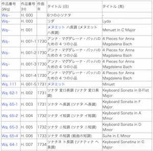 This site contains three lists of works by Emanuel Bach. Since his works have at least two types of catalog numbers, we have created alist in Wq number order and alist in H number order. Additionally, there is alist in chronological order of composition. These lists are compiled by aggrega ...